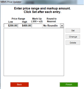 - Click the Set button. The information you entered will be entered into the list and the Lowest and Highest values will change in preparation of your next price range.
