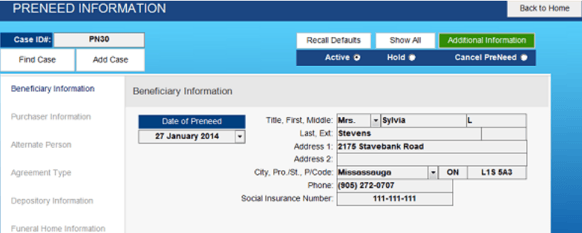 The Beneficiary Information tab stores the date you met with the pre-need and basic information about the beneficiary of the policy.