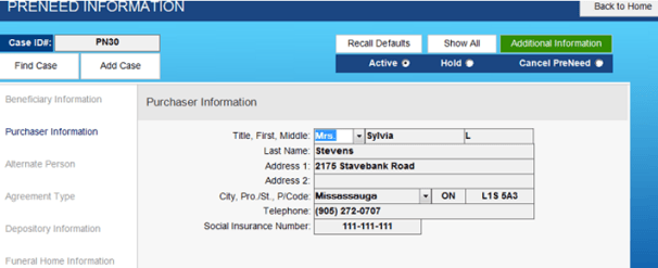 The Purchaser Information tab is for storing information on the purchaser of the pre-need policy; this can be the same person as the beneficiary.