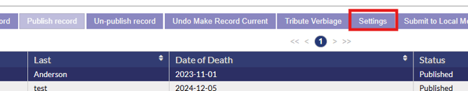 On the Death Records page, features can be toggled on or off via the death record settings button. To access settings for a record, simply highlight the record in the death record list and click the settings button.