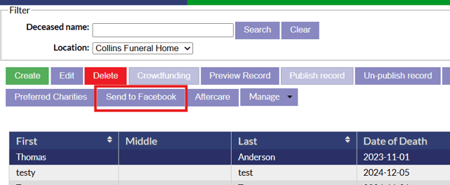 Once your account is connected to the website, obituaries can be directly posted to your Facebook page from the Death Records section of your admin dashboard. On the Death Records page, highlight the obituary you want to post from the records list and then click the "Send To Facebook" button. This will create a post of the obituary on your Facebook page.