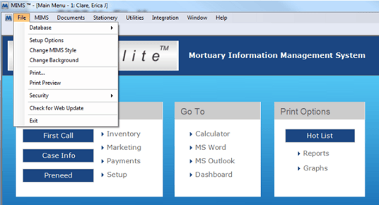 The file menu options in MiMS give access to multiple settings and functions regarding databases, setup options, background options, page printing, updates and security.