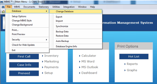 In the case you have multiple different MiMS data files you work with, this option will take you to a screen that will allow changing which database your MiMS is looking at.
