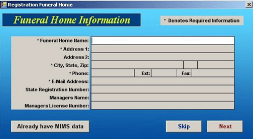Laptop functions are built into every MiMS system. These functions allow you to easily create a full copy of your office's database on your laptop computer, so you can take your information outside the office for meetings, arrangements, etc. Then, when you return to the office, you can easily update your office's main database with the information you entered while you were gone - all without overwriting information that was entered in the office while you were away.