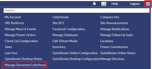 To setup a letterhead in your Family Arranger system, go to the three horizontal bars in the top right corner of your system to open the system settings and select the "Manage Document Letterhead" option.