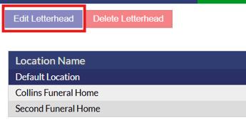 When you are on the document letterhead page, all locations that you have setup in your Family Arranger system will appear. If you only have the one location, this will be titled “Default Location”. You are able to have different letterheads for each location. In order to add a letterhead to your system, select the location you wish to add a letterhead too, then click the “Edit Letterhead” button located in the top left corner.