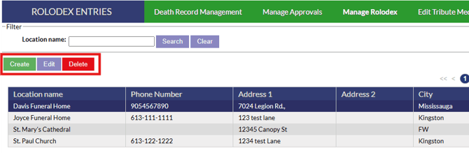 Clicking on the “Manage Rolodex” button from the Death Records page will bring you to a page that lists all of the locations in your system. These locations will automatically save and fill when you enter information into a Death Record. From here, you will have the ability to adjust information or add new information.