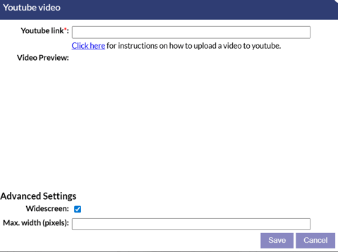The upload image option allows you to upload an image from your device. The add Youtube video option will open a window where you can add a link to a Youtube video. Once the video link is saved, the video will be added to the media files section and can be used directly on your website or on record pages. Additional settings are available for Youtube videos to make them widescreen or adjust the pixel width the video will display with.