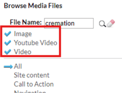 The file type can be filtered using the checkmarks below the search bar to further refine your search. Check or uncheck file types in order to determine whether they will appear in the search.
