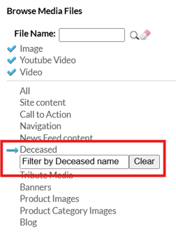 Categories can also be selected to browse specifically in a given category. These categories are assigned based on where the file was initially uploaded. The deceased category has a search bar so you search by the decedent’s name.