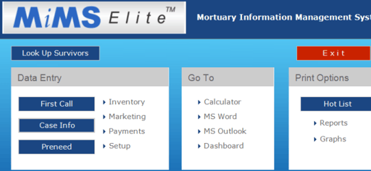 Using the DATA ENTRY buttons, you will enter all information: basic setup information, "At-need" and "Preneed" information, inventory, customer payments, even deaths from your local newspapers.