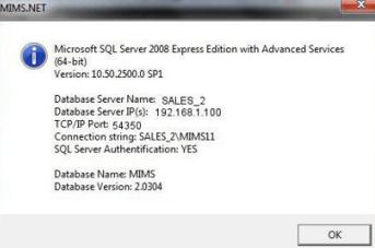 - Finally, if using the IP Address of the database server still does not work add a comma and the TCP/IP port to the end of the Connection string and click “OK” and MiMS will connect to the database and open up.