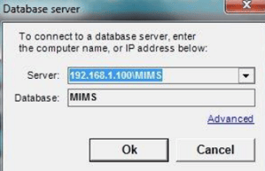 - Back on the workstation “Database Server” window try typing in the exact name that was on the Connection String line and clicking “OK”. If everything is working correctly then MiMS should connect to the database and open up.
