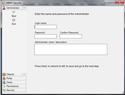 MiMS security is located under “Security” section of the “File” menu. To start using MiMS Security click on the “Start MiMS Elite Security” button. The “MiMS Security” window will appear.