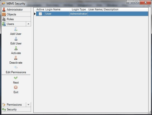 The Users tab is the 2nd of the 3 tabs used for setting MiMS to run in Program Secured mode. This tab is designed to setup all of the user logins for MiMS and each user’s permission level.
