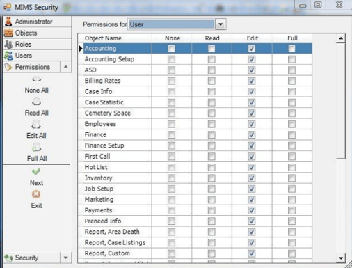 In the Advanced view you will get a split window. On the left side is a list of all areas of MiMS to secure and the right side lists the permission levels for those areas.