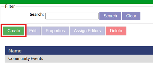 On the news and events page, categories can be created to group different news or events into. Click the green create button to add a new category.