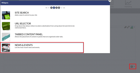 The second option is to add a widget content box on an existing page to display news and events. To do this, set a content box type on a page to widget. From the list of widgets, select the news and events widget.