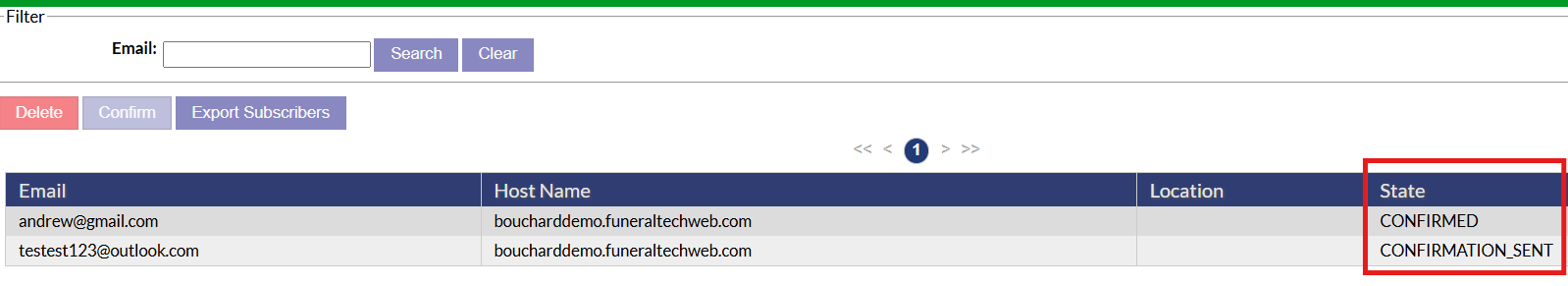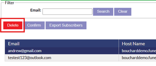 On this page, all subscribers will be listed out showing their email, the site they subscribed on, the location they subscribed for and the status of their sign up. To delete a subscriber, simply highlight the email and click the delete button.