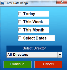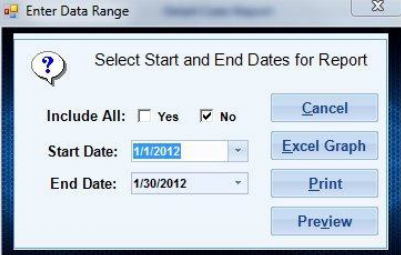 - Click a specific report. Where appropriate, a pop-up box will appear asking you for the specific data sorting and filtering options for which you want the report printed. In most reports a Date Range option will be the final or possibly only option which will give you an option to just print the report right away or preview the report before printing.