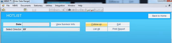A HOT LIST is developed from the actions that were selected when survivor information was entered. Any date range the user selects, from one day to several months, may call up a Hot List. The HOT LIST is an excellent way to ensure that your follow-up program doesn't fall through the cracks when you get busy.