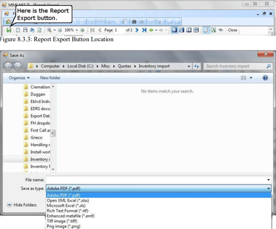 - To print the report after viewing, choose Print from the File menu, or click the Print button. In the event that you wish to export the data outside of MiMS click on the export button. A “Save As” window will open to choose the file name for saving the report outside of MiMS. This window is also where you choose what kind of file the report is supposed to be.