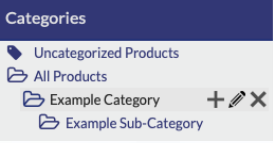 To Delete a category, click on the “X” sign next to the category. Note: Deleting a category will mark all products in it as uncategorized.