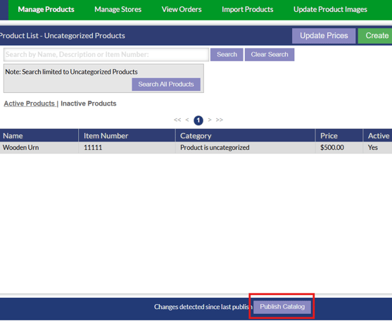 If you have made any changes to your catalog such as changing product details, adding products, adding categories, moving categories or products around, you will need to publish your catalog for the changes to show up on the live website. To publish changes, click the publish catalog button at the bottom of the page.