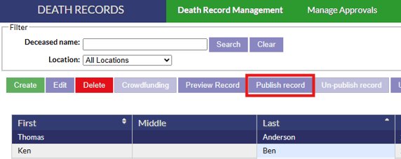 To publish a record to display on the website, click on the name of the deceased on the “Death Records” page and then click on the "Publish Record" button at the top.