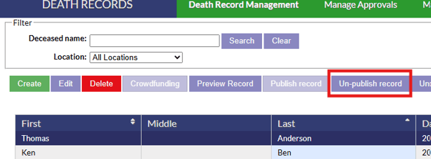 If you need to un-publish the record, simply click on the un-publish button after highlighting the decedent’s name.