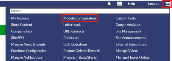 A single funeral home location can be set up in the system settings. Go to the three horizontal bars in the top right corner of your system to open the system settings, then select the "Module Configuration" option.