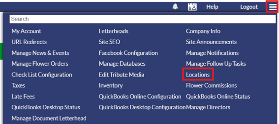 To setup funeral home locations in Family Arranger, go to the three horizontal bars in the top right corner of your system to open the system settings and select the "Locations" option.