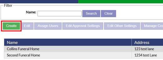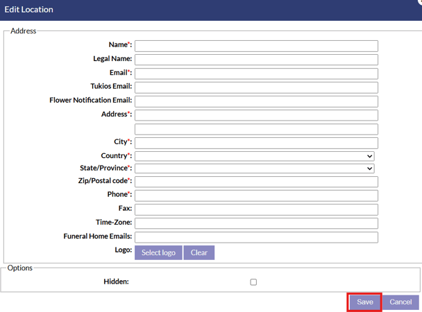 A pop-up window will be displayed where the funeral homes information can be entered. After all the information has been filled in click the “Save” button in the bottom right corner. Repeat the same steps to add as many funeral home locations needed.