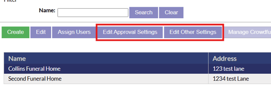 Certain settings such as approval settings for condolence messages, enabling/disabling memorial trees, enabling/disabling donations and enabling/disabling tribute book can be configured on a per location basis using the "Edit Approval Settings" and "Edit Other Settings" options.