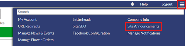 The site announcements feature on Funeral Tech sites allows for announcement pop ups to be added to a website. To access the site announcements page, click on the site settings icon in the upper right corner and select the "Site Announcements" option.