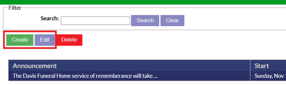 The site announcements page will list out any active or inactive site announcements that have been added to the site. To create a new announcement, simply click the green "Create" button. To edit an existing announcement, highlight the announcement in the list and click the "Edit" button.