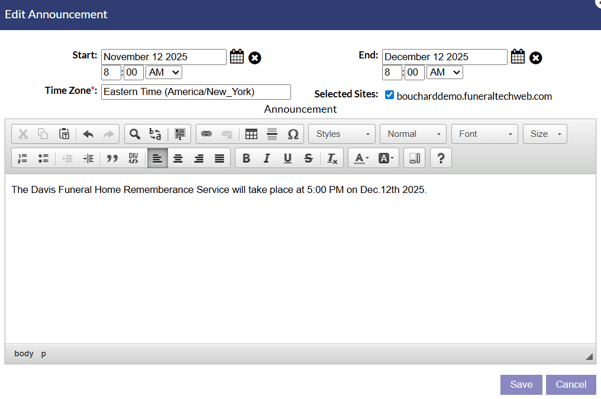 When creating or editing an announcement, a date and time can be entered to configure when the announcement should be visible on the website. A time zone can also be selected for this time range. If you have multiple sites in the system, the site you want the announcement to show on can be selected from the selected sites list. In the announcement section, use the text editor to add the message you want to display.