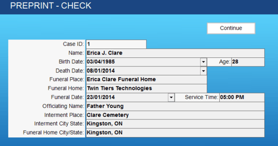 - Select the type of stationery you want to print (Acknowledgement Cards, Bookmarks, Memorial Folders, Prayer Cards, and Register Books) and then select the size and style if applicable. A PREPRINT - CHECK window will appear. This window gives you an opportunity to alter the information before it is merged into the stationery document you are about to print.