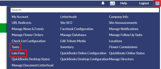 Taxes and late fees can easily be set up in the system settings area of Family Arranger. To access these sections, click the 3 horizontal lines in the upper right corner to open the system settings. A taxes option and late fees option are available here.