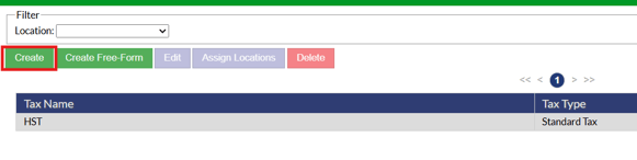 On the taxes page in system settings, different taxes can be set up for locations. Any taxes set up in the system will show in the taxes list. To add a new tax, click the green "Create" button.