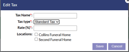 On the tax set up window that appears, a few options are available to configure for the tax. Add a tax name, type of tax (Standard or Range), the tax rate percentage and which locations the tax should apply to.