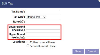 If the range type is selected, two additional options will be available to set the lower and upper bound for the tax to be included or excluded.