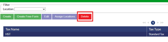Taxes can be deleted by highlighting the tax in the list and clicking the "Delete" button.