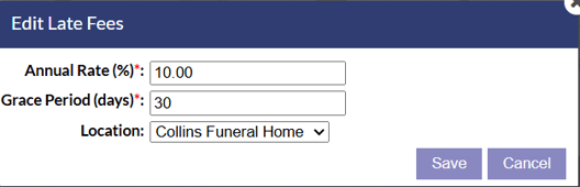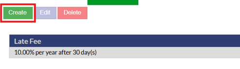 On the late fees page, any late fees currently in the system will display in the list. To add a new late fee, click the green "Create" button. A few options are available to configure the late fee you are adding, annual percentage rate can be set, grace period in days and the location to apply that late fee to.