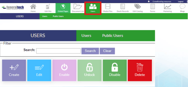 User accounts can easily be managed in Funeral Tech systems via the users tab. A variety of roles and permissions can be configured for a user along with options to make changes to their name, email and password.