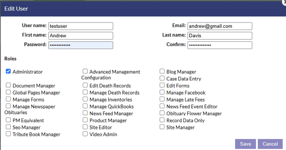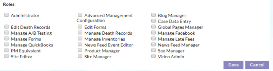 Once you have created a user, you will need to define what type of access/permissions they have when they are logged into the system. You can select multiple roles for the user or even just one depending on what areas of access you want to grant them within the CMS System. Note that some of these user roles are not applicable to all modules in your system.