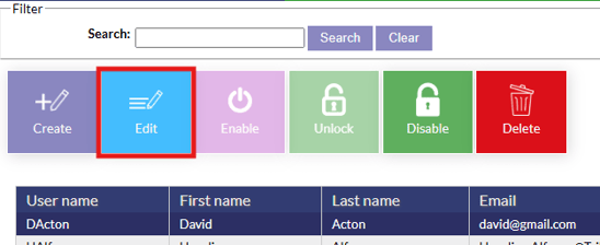 If the user is already created and changes are required, simply click on the user you wish to change then click the “Edit” button. This will display the same pop-up window from when the user was first created. In this window you can make changes for the user.