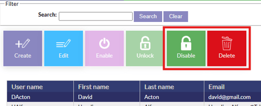 To delete a user, simply highlight the user in the list and click the red delete button. Users can also be disabled if you wish to keep their account in the system but disable access. To disable a user, simply highlight the user in the list and click the green disable button.