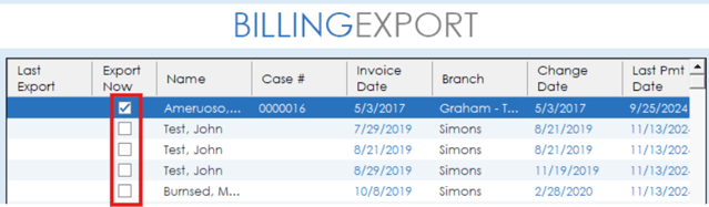 The export tab of the accounting page will allow you to export case financial details to your accounting software. Cases will be listed out in the case list, displaying information regarding the name, case number, invoice date, branch, change date, last payment date, number of payments needed, number of adjustments needed and whether the case is locked. A toggle box is available to mark the case to be exported.
