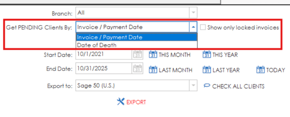 At the bottom of the section, options are available to configure what cases you want to see in the case list. Cases can be filtered by branch and start/end date range. An option is also available to get pending clients by invoice/payment date or date of death. If you only want to show locked invoices, use the toggle box beside the drop down that says "Show only locked invoices".
